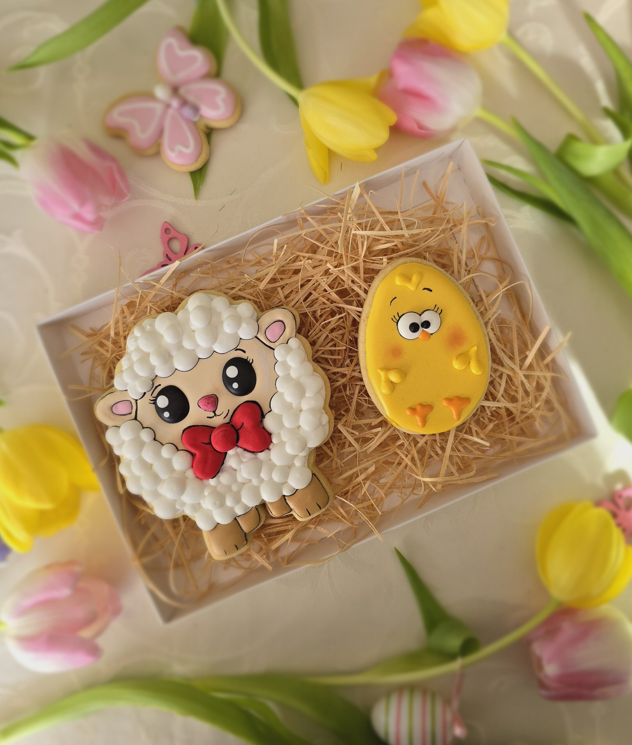 Ciasteczka wykonane artystycznie przy użyciu lukru królewskiego (royal icing), w pełni jadalne. Zestaw pakowany w ozodobne pudełko ze wstążką.