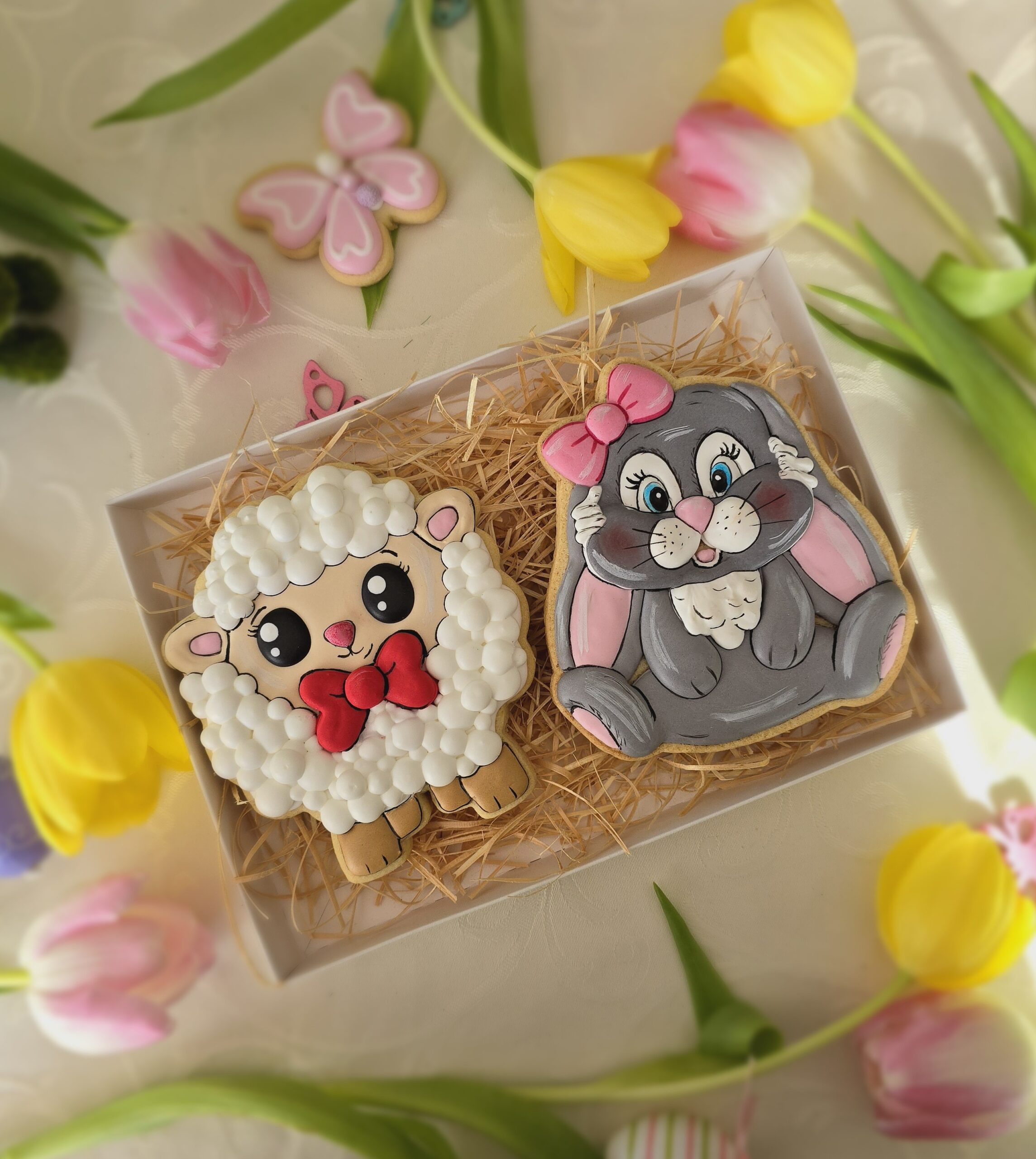 Ciasteczka wykonane artystycznie przy użyciu lukru królewskiego (royal icing), w pełni jadalne. Zestaw pakowany w ozodobne pudełko ze wstążką.