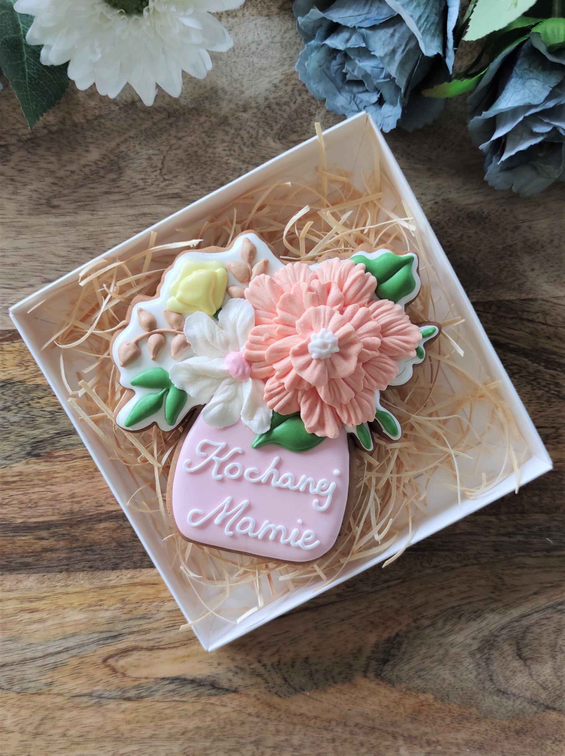 Piernik wykonany artystycznie przy użyciu lukru królewskiego (royal icing), w pełni jadalny. Pierniczek pakowany w celofanowy woreczek ze wstążką.