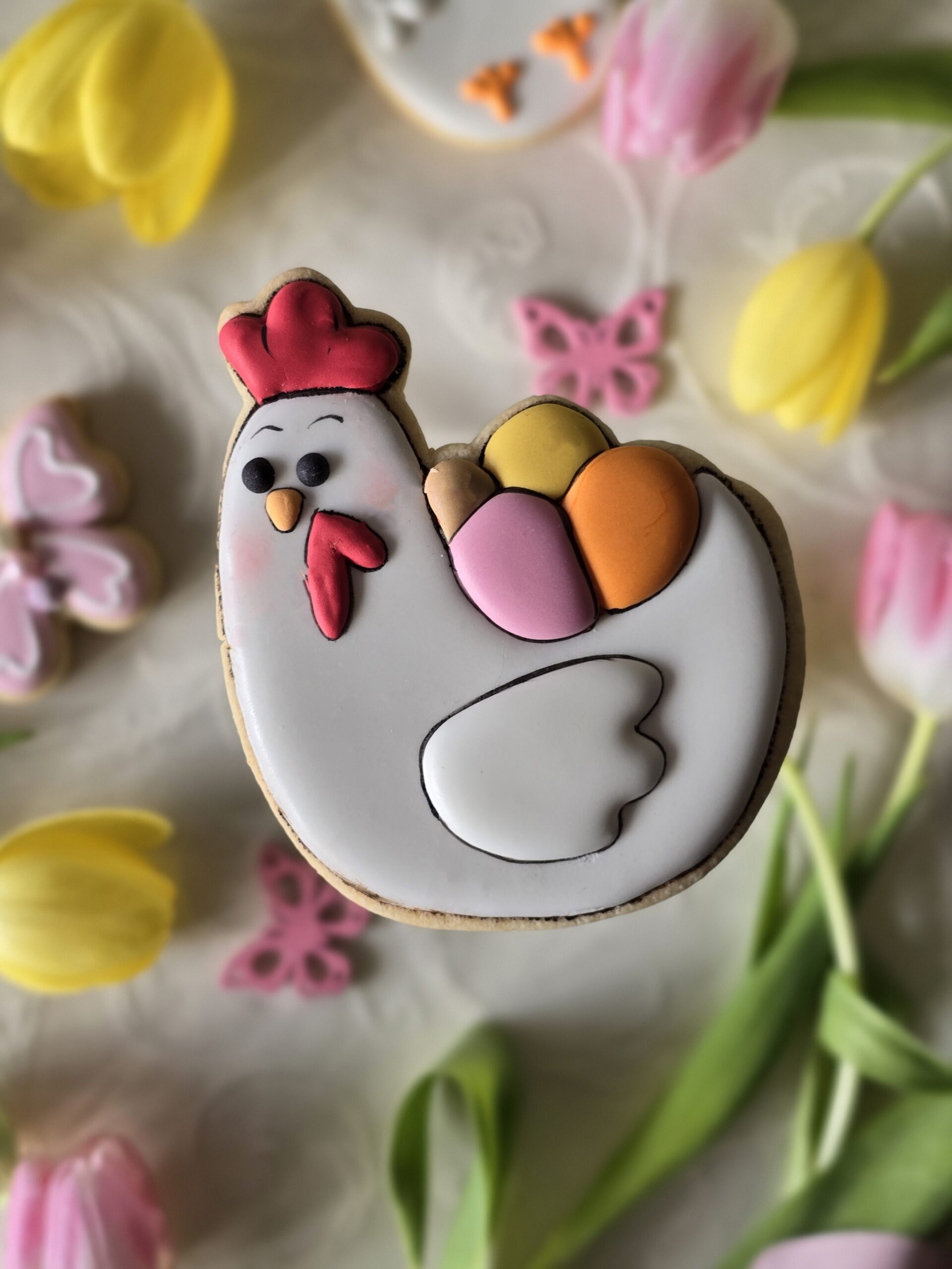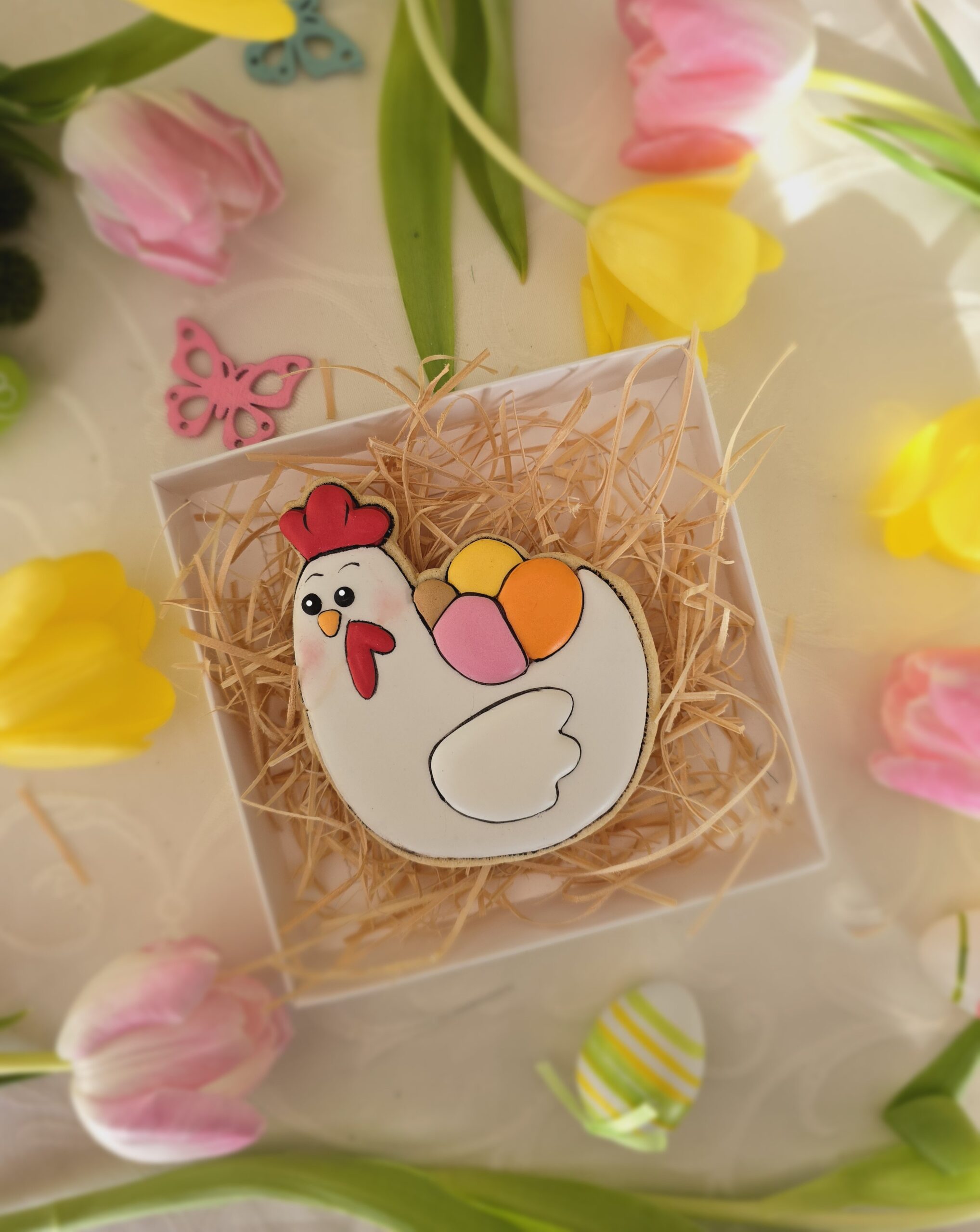 Ciastko wykonane artystycznie przy użyciu lukru królewskiego (royal icing), w pełni jadalne. Pakowane w celofanowy woreczek ze wstążką.