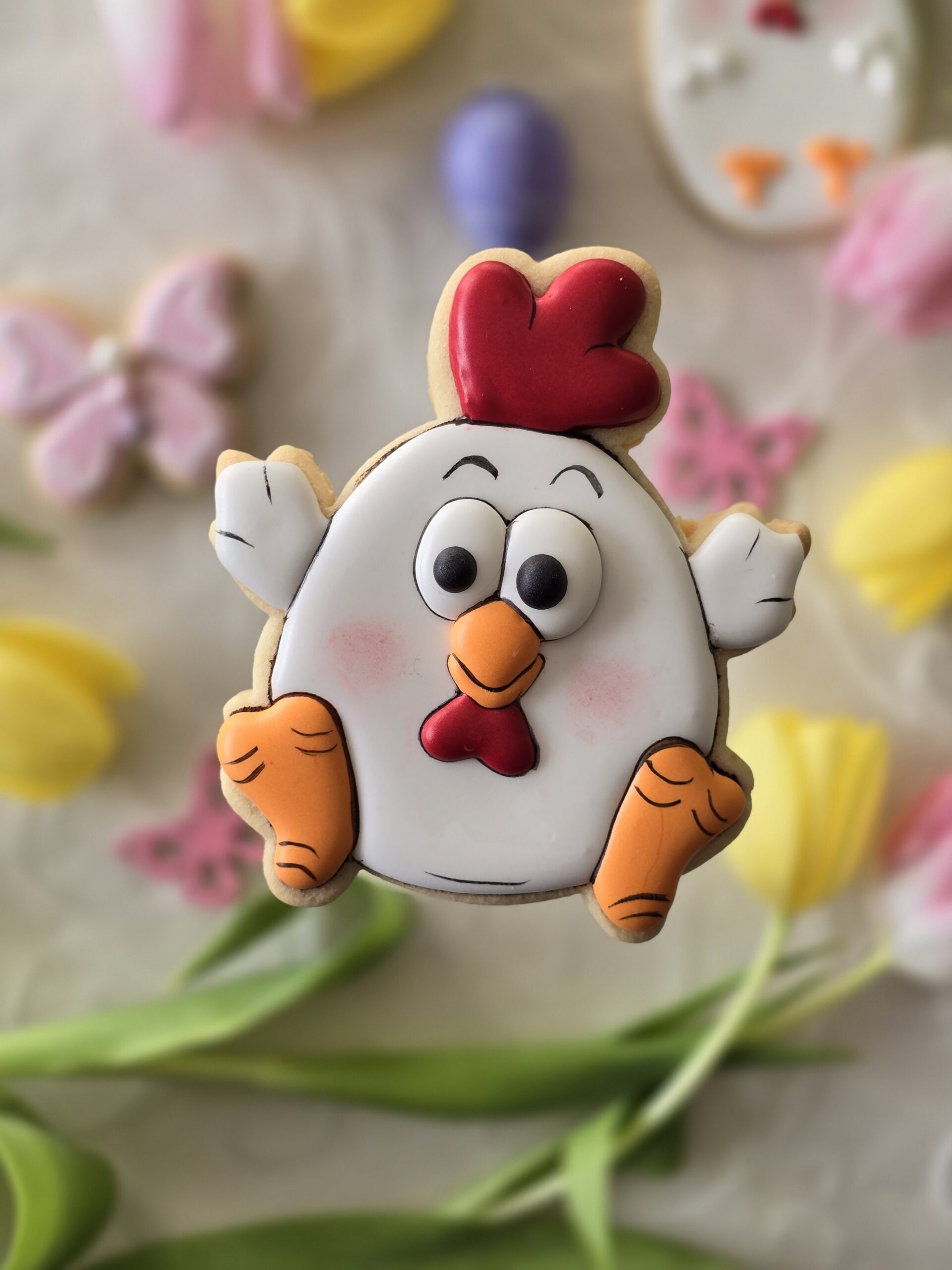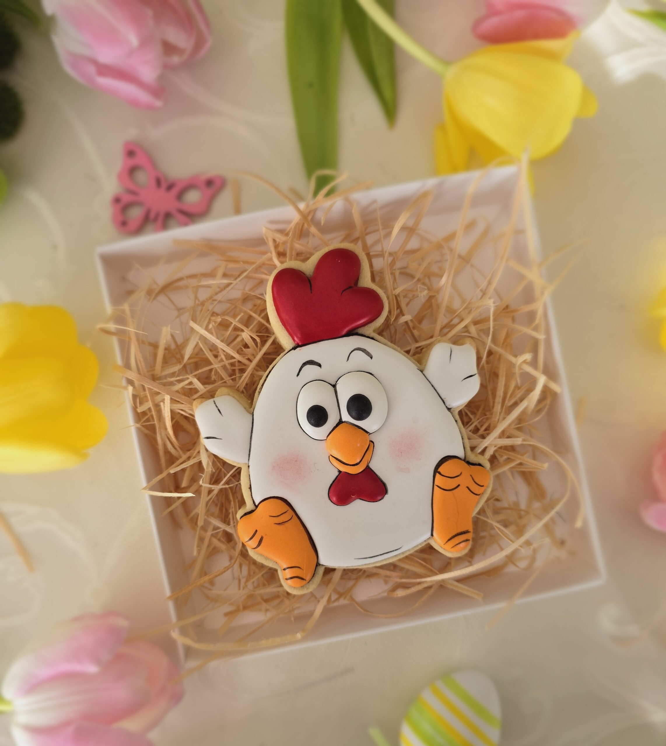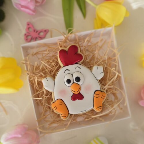 Ciastko wykonane artystycznie przy użyciu lukru królewskiego (royal icing), w pełni jadalne. Pakowane w celofanowy woreczek ze wstążką.