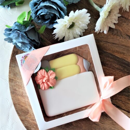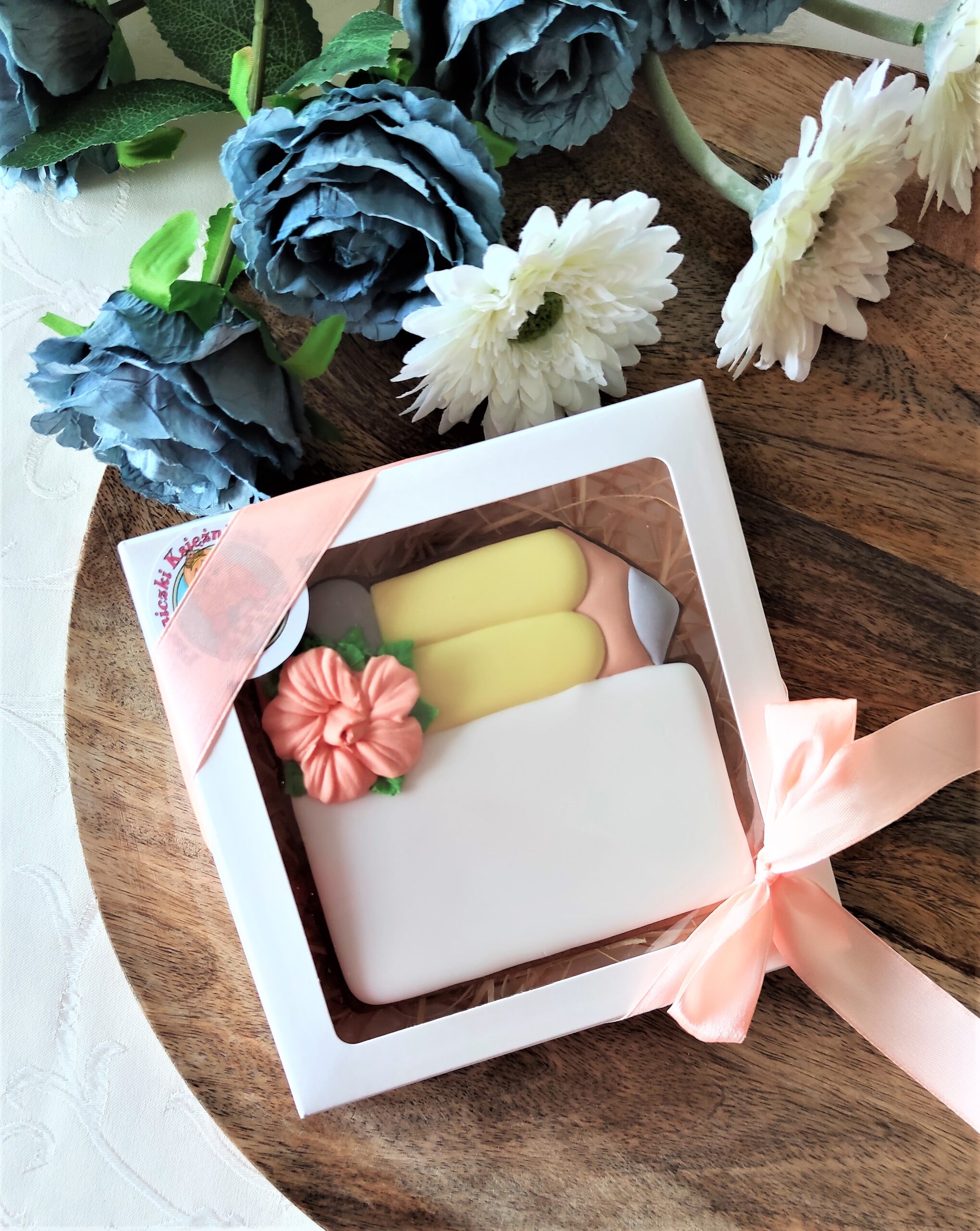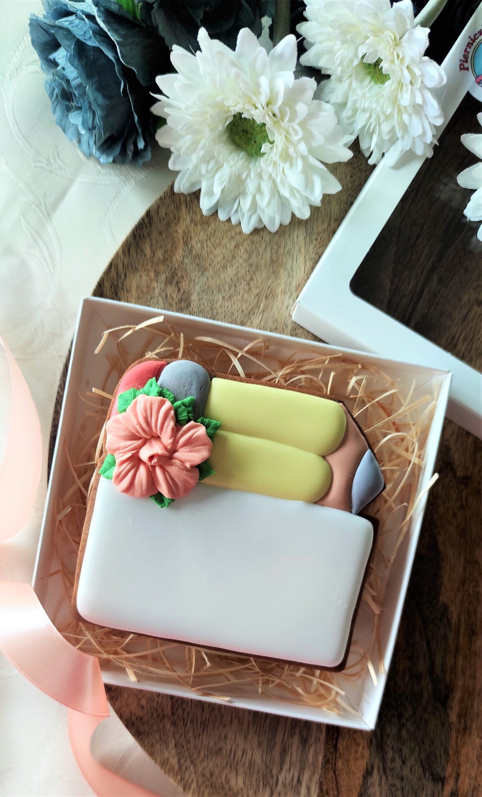 Piernik wykonany artystycznie przy użyciu lukru królewskiego (royal icing), w pełni jadalny. Pakowany w ozdobne pudełko ze wstążką.