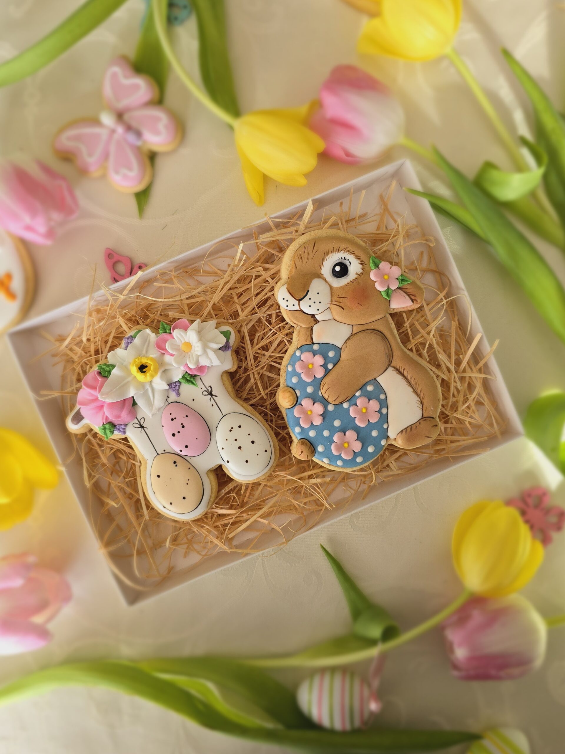 Ciasteczka wykonane artystycznie przy użyciu lukru królewskiego (royal icing), w pełni jadalne. Zestaw pakowany w ozodobne pudełko ze wstążką.