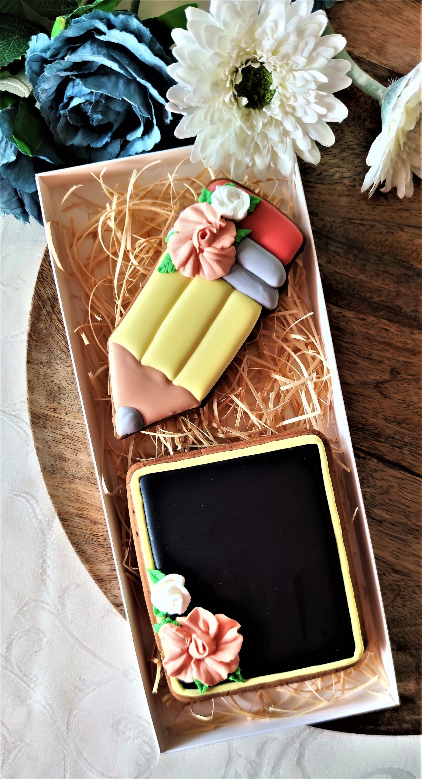 Piernik wykonany artystycznie przy użyciu lukru królewskiego (royal icing), w pełni jadalny. Zestaw pakowany w ozdobne pudełko ze wstążką.