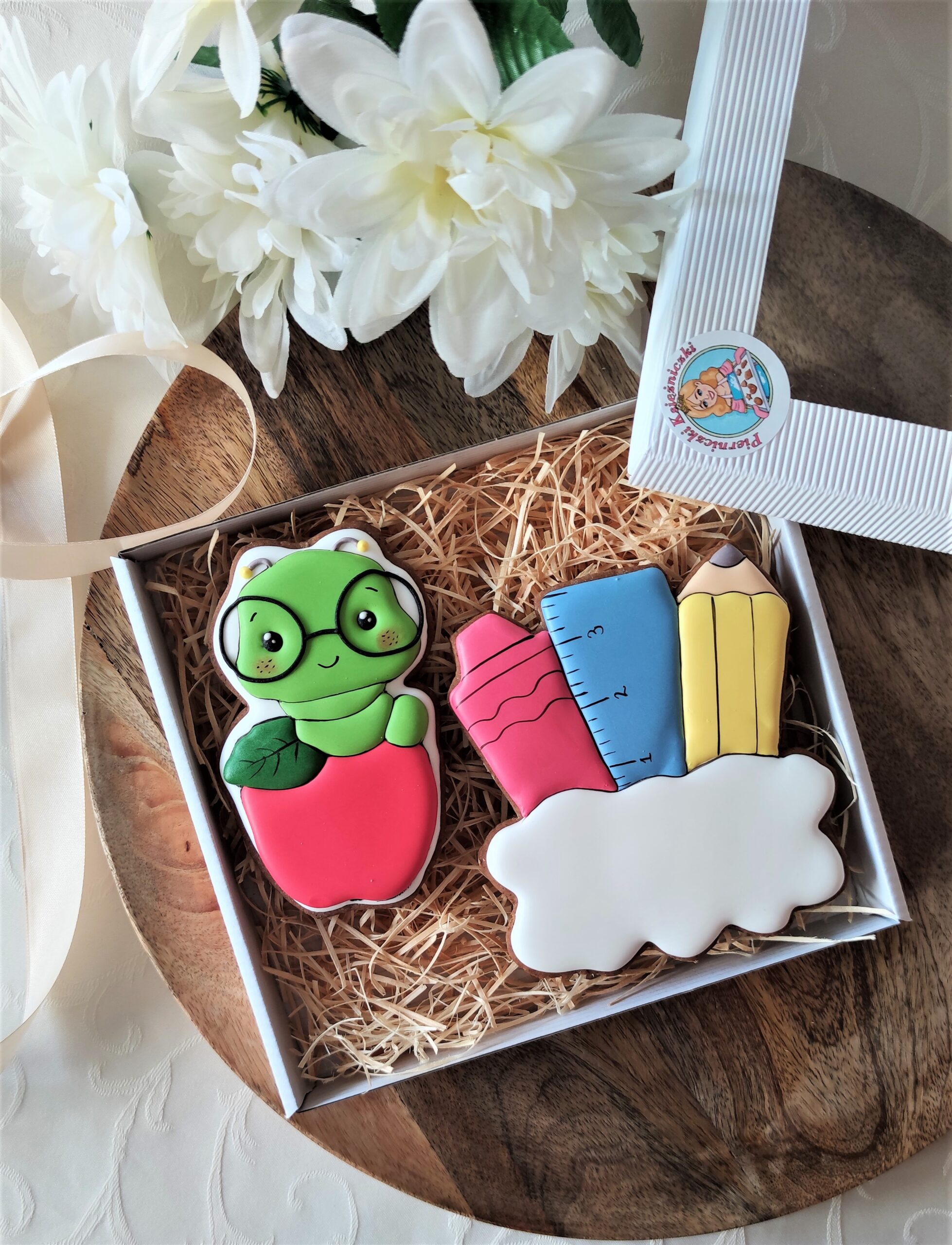 Piernik wykonany artystycznie przy użyciu lukru królewskiego (royal icing), w pełni jadalny. Zestaw pakowany w ozdobne pudełko ze wstążką.