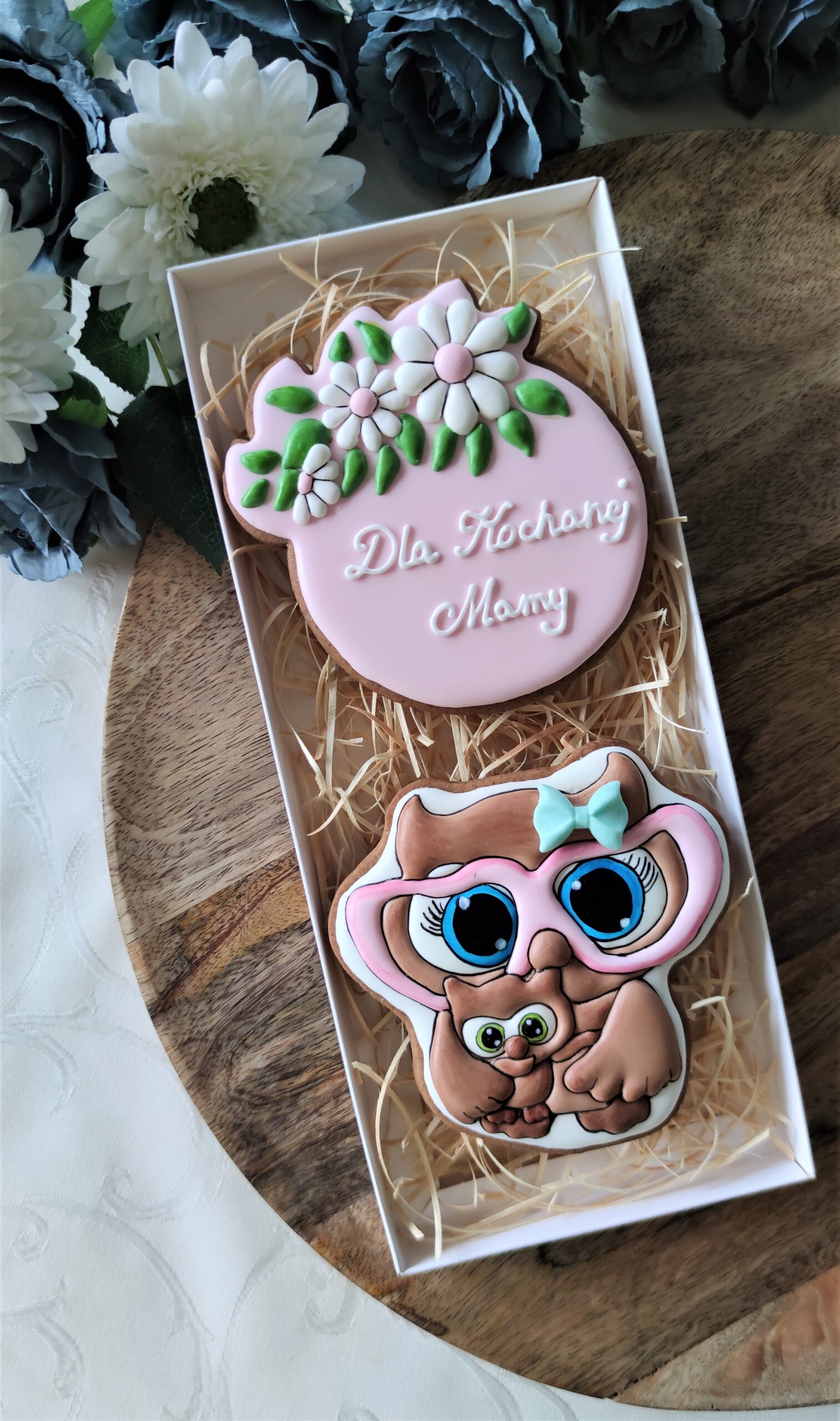 Pierniki wykonane artystycznie przy użyciu lukru królewskiego (royal icing), w pełni jadalny. Zestaw pakowany w ozodobne pudełko ze wstążką.